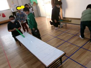 力加減が難しく思うようにいかない場面もありましたが、ペアの児童と「せーの」や「こうしよう」などと声を掛け合いながら取り組む子どもたち。