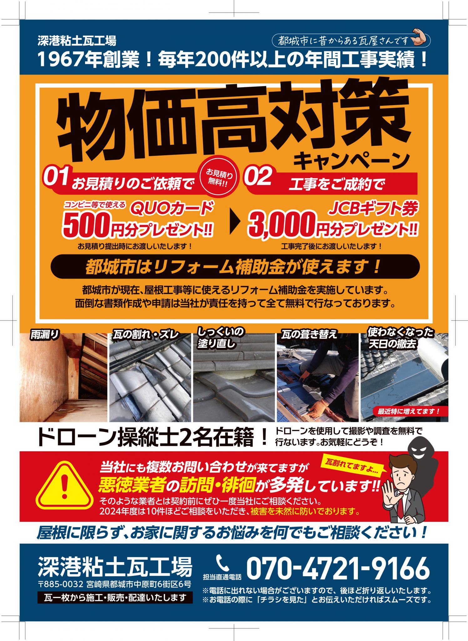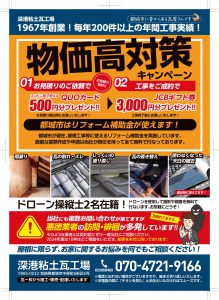 深港粘土瓦工場 電話番号 0986-25-9189 ホームページ https://fukaminato.net/ ライフ 住宅 駐車場あり ホームページの更新情報 2025/12/21 折込チラシをうちました✨ 20日の土曜日に初めてとなる当社のチラシをうちました お目にした方もいるかもしれません お得なキャンペーンを実施中ですので、是非ご相談下さい。 2025/12/15 ドローンによる空撮📸 こちらはドローンで撮影したお客様宅の屋根です 現在のドローンでは、かなりの高度から撮る事が可能です(*^^*) 普段自分のお家を上から見る事はないのでお客様にも喜ばれます 2025/12/05 瓦一枚からでも😊 我社のキャッチコピーに 「瓦一枚からでも施工・販売・配達致します」 という文言があります(*^^*) その言葉通り、今回は瓦一枚の差し替えです しかしいざ屋根に上がってみると他にも割れてる瓦があったり、別の問題が見つかったりする場合があります 今回は一枚だけの予定が隣りもヒビが入っており2枚の交換になりました でもお値段はそのまま一枚分だけです サービス精神旺盛です(笑) 2025/11/18 ハト小屋解体🕊 屋根からピョコンと突き出た屋根を正式にはドーマーと言うのですが、業界の一般的な呼び方は「ハト小屋」と言ったりします 陽の光の射しこみに用いられたり、景観に優れた飾りとして作られたりと様々です 今回の葺き替えではハト小屋はもう必要ないので同時に撤去して欲しいとの事でした 撤去前、その後葺き替えのbefore afterです 2025/11/08 久保産業様 展示会😆 本日11月8日、明日9日は久保産業様の展示会を開催しております 毎年年2回開催されており、とても賑わう展示会です 深港粘土瓦も大変有難い事に毎回参加させて頂いております ̖́- 敷地内には様々なブースがあり、食べ物の無料提供も行っております 弊社のブースではポップコーンをお配りしてますので、お立ち寄りの際はぜひ足をお運び下さい お店からのお知らせ ウェブサイトを公開しましたので、ぜひご覧ください! お店へのアクセス 住所 宮崎県都城市中原町6街区6号 地図